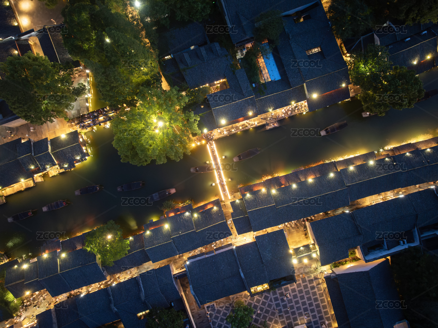 浙江嘉兴桐乡乌镇西栅景区江南水乡航拍夜景