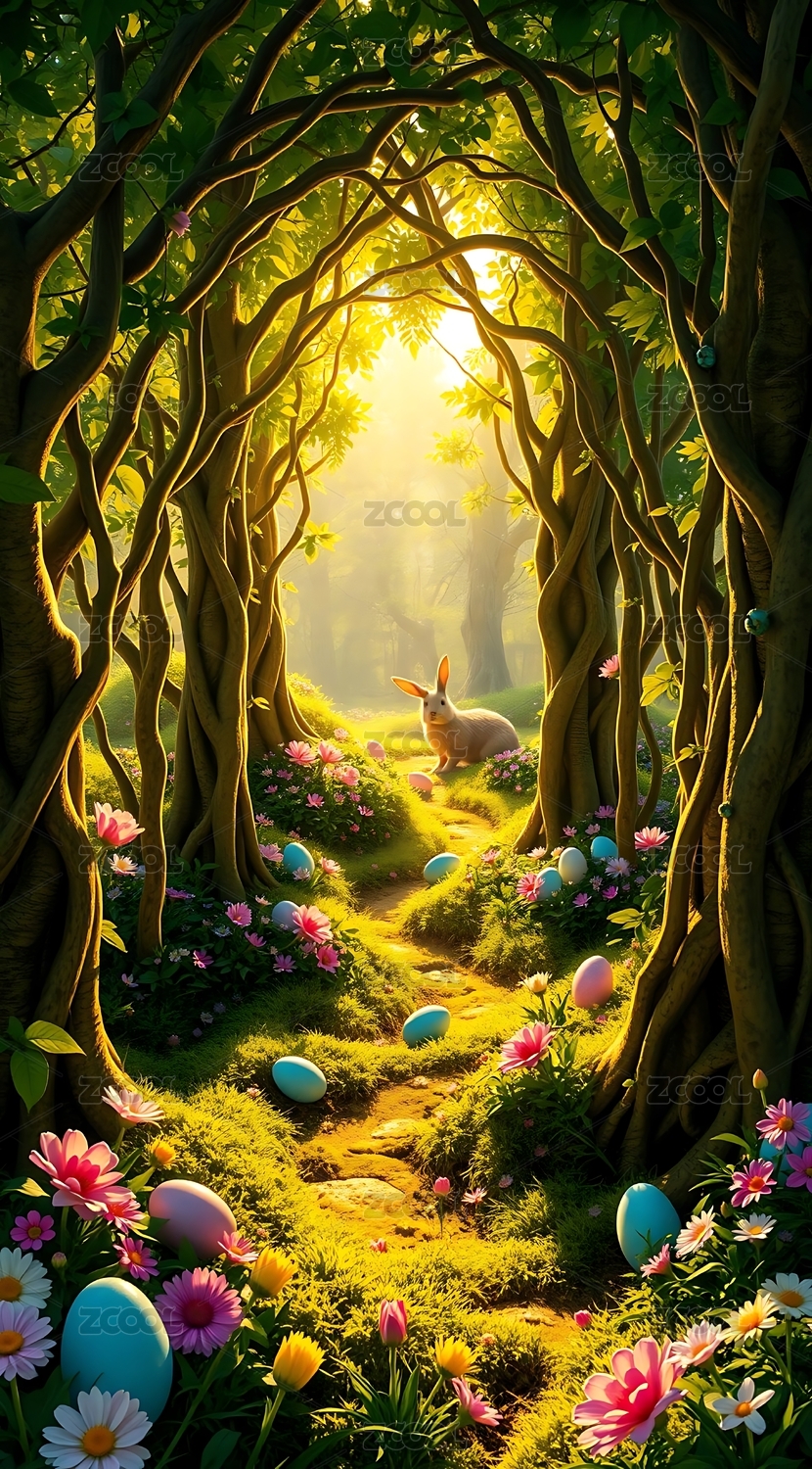 阳光下的森林小径上的彩蛋