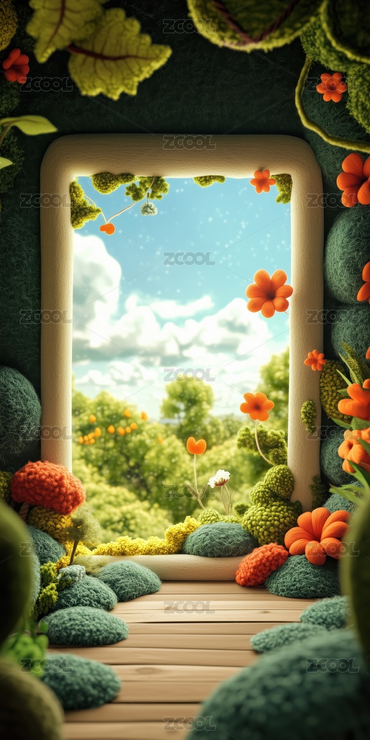 时尚室内窗外风景羊毛毡毛绒3D卡通插画