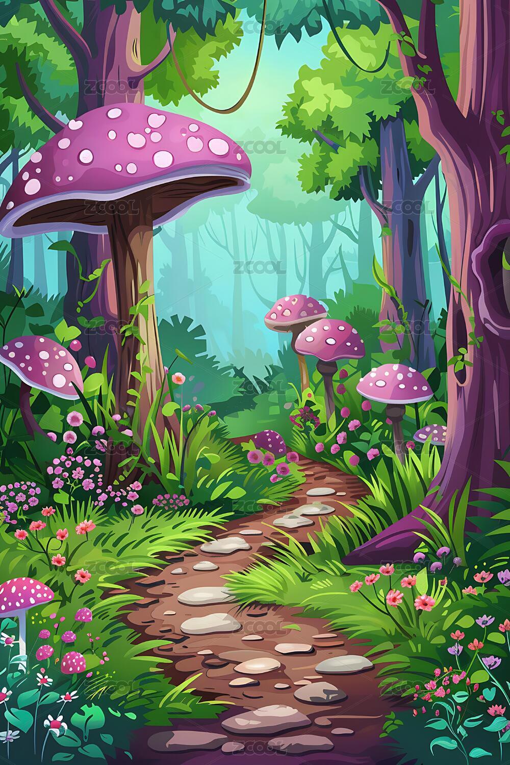 梦幻森林小路与粉红蘑菇花朵