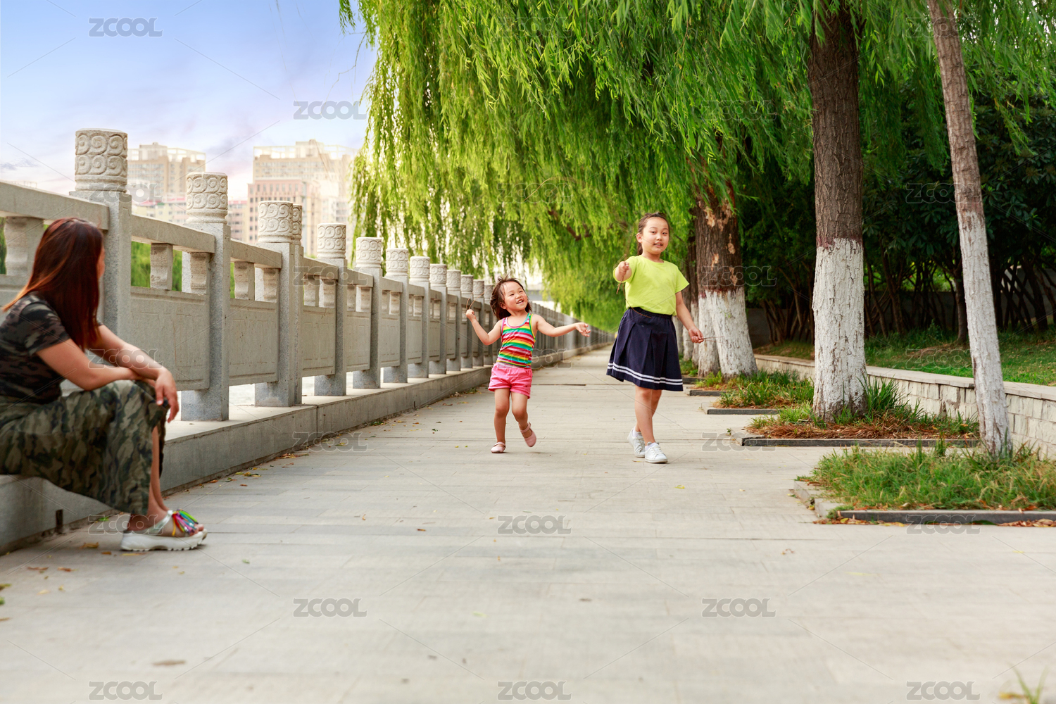 公园里河边妈妈坐在地上看着小姐妹开心玩耍