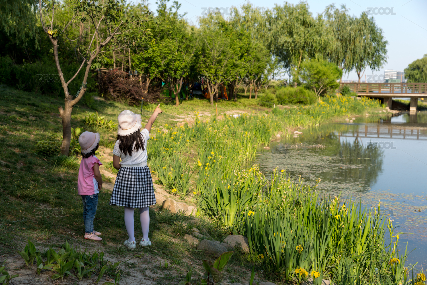 两个小女孩在小湖边上玩水