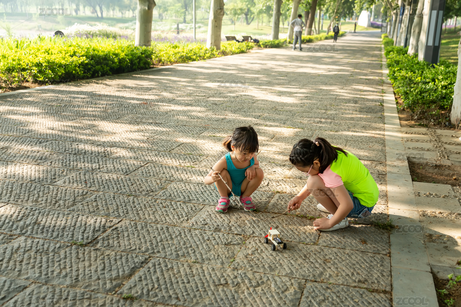 蹲在人行道上玩耍的两个小女孩