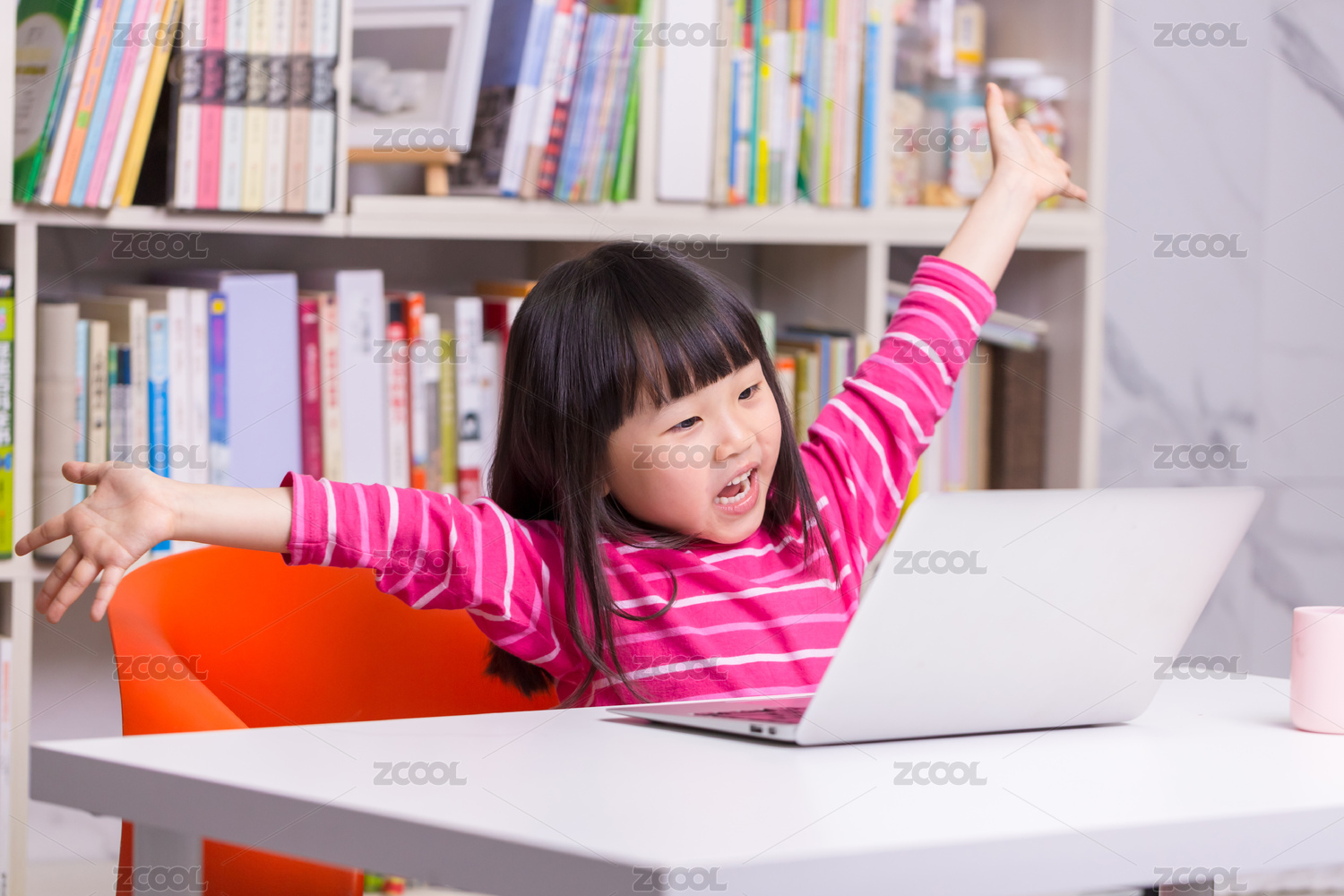 小女孩坐在电脑前面对镜头自信的举着双拳