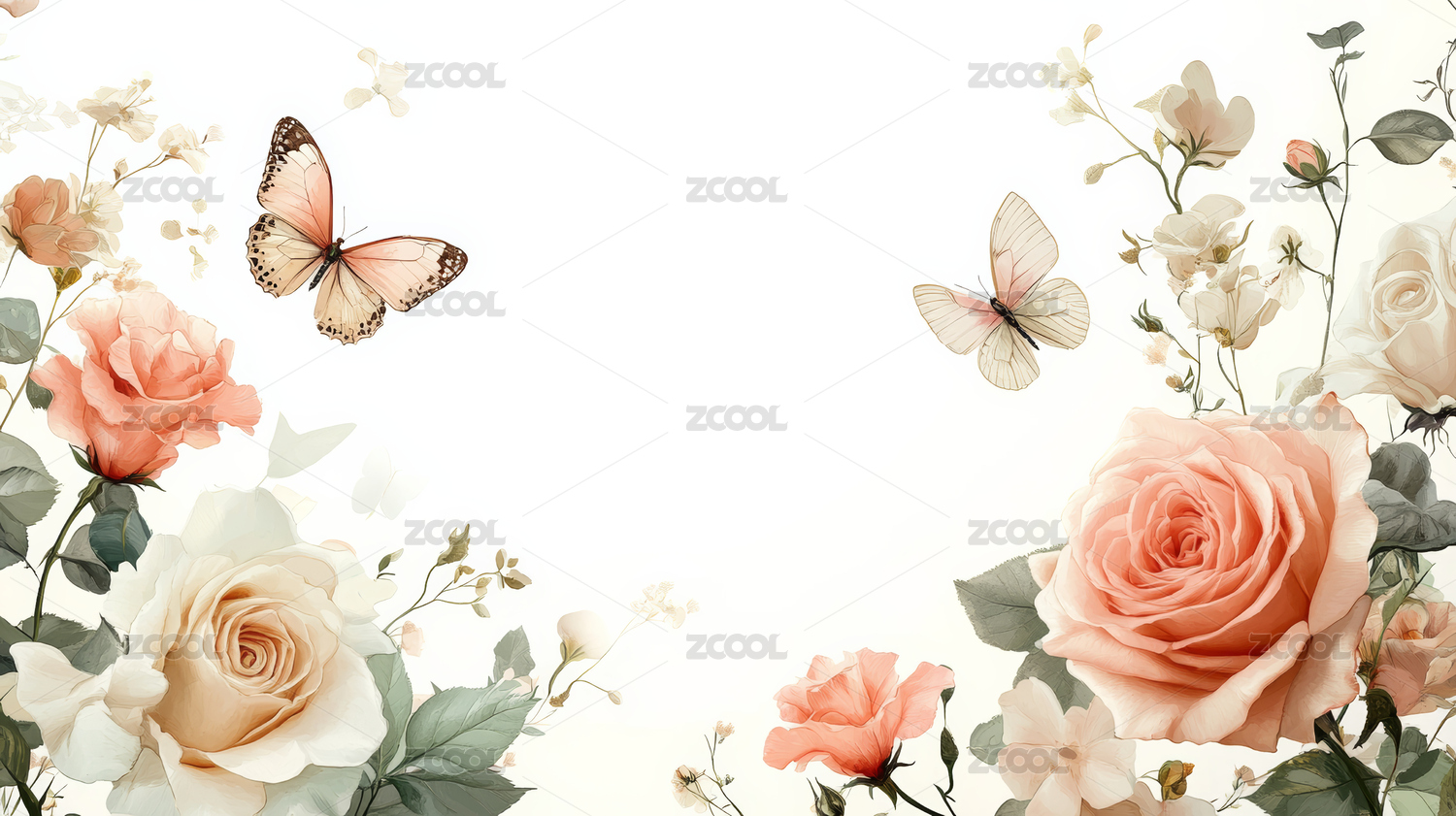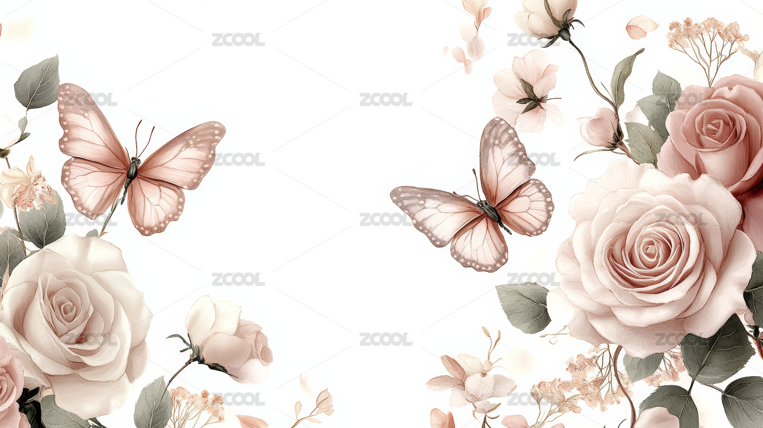 粉红色背景下的花朵和蝴蝶的特写镜头