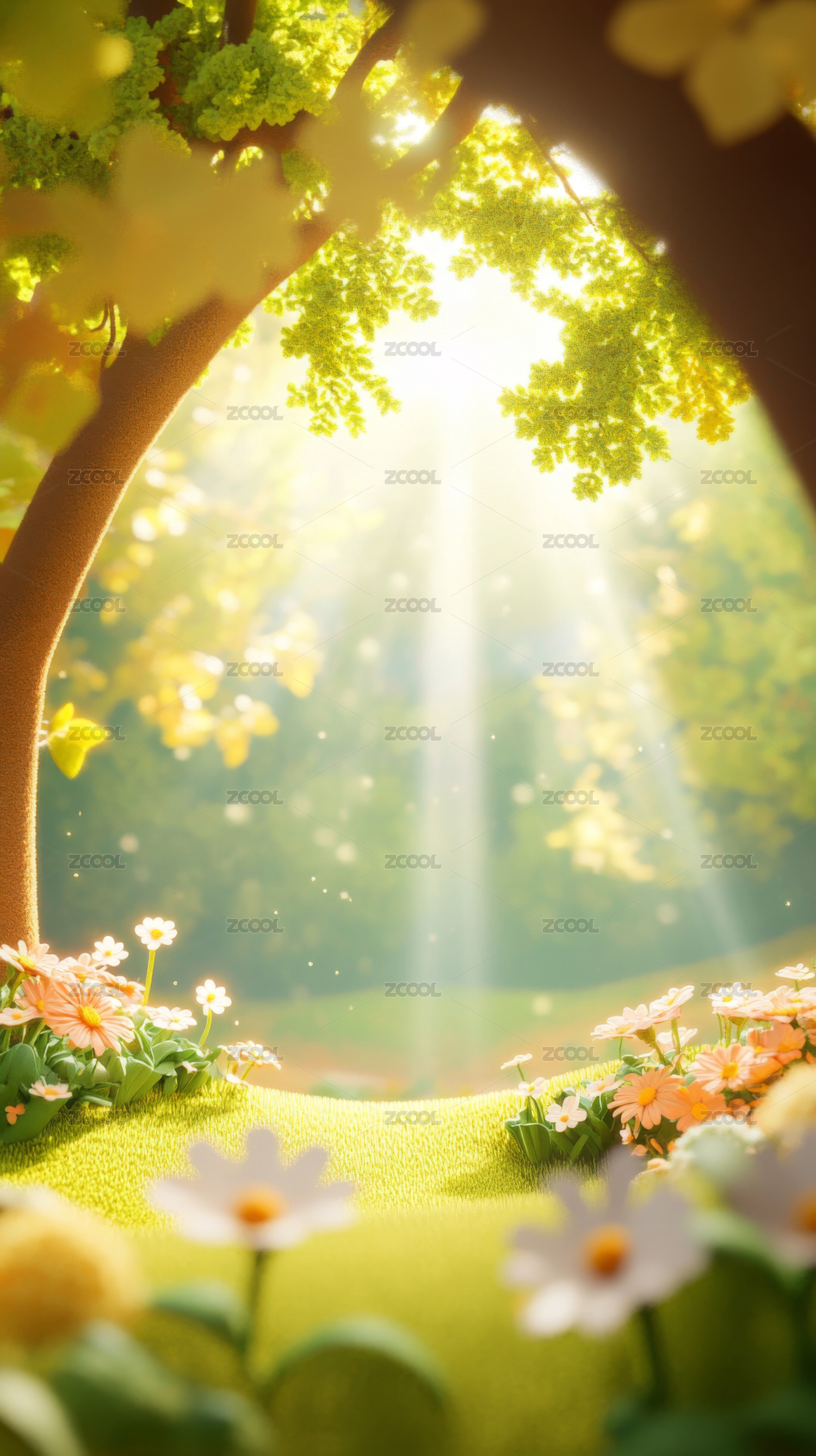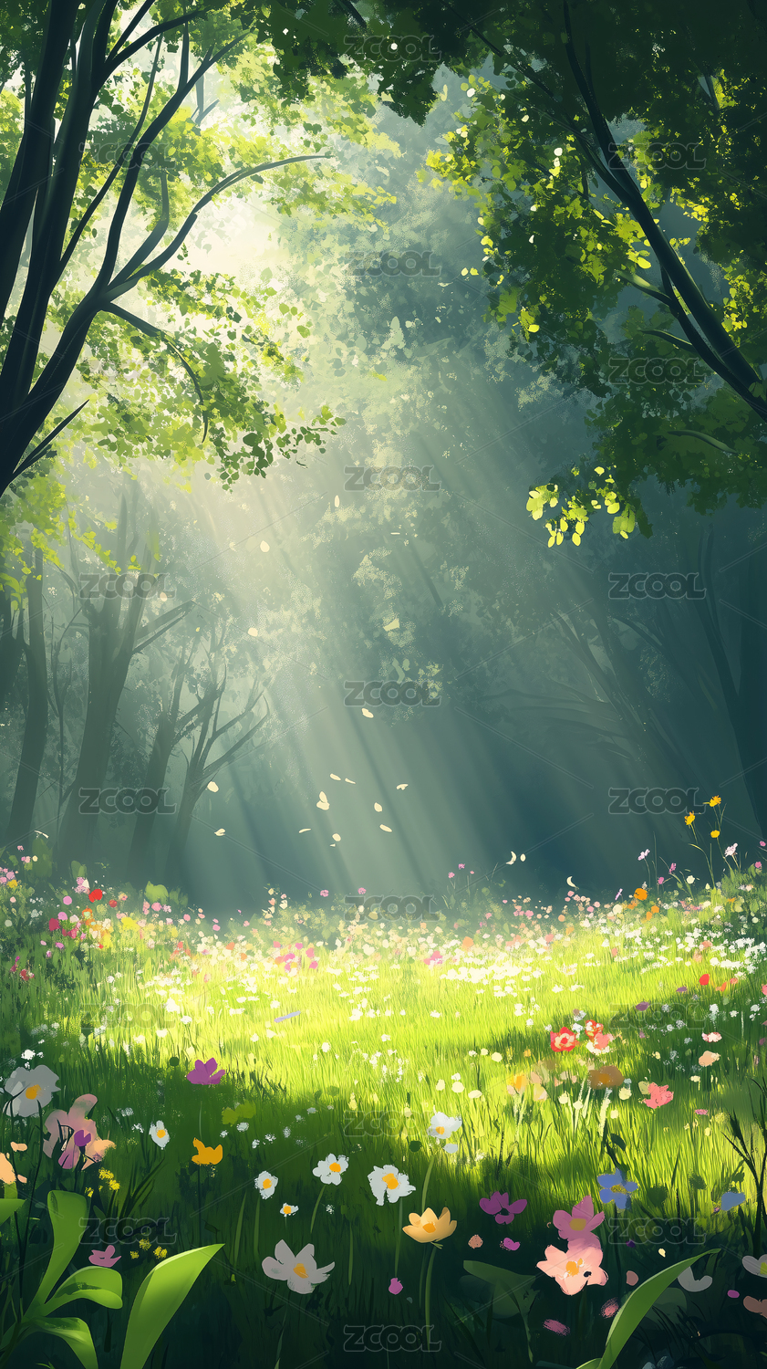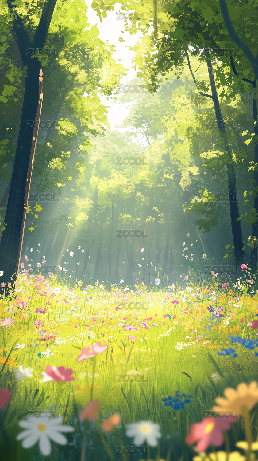 阳光穿透森林,野花点缀绿意