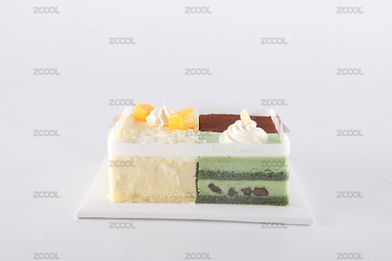 白色背景一块正方形的水果奶油蛋糕