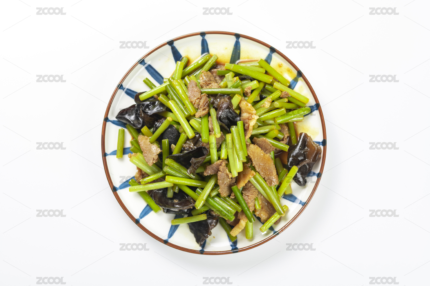 盘子里的蒜苗炒肉