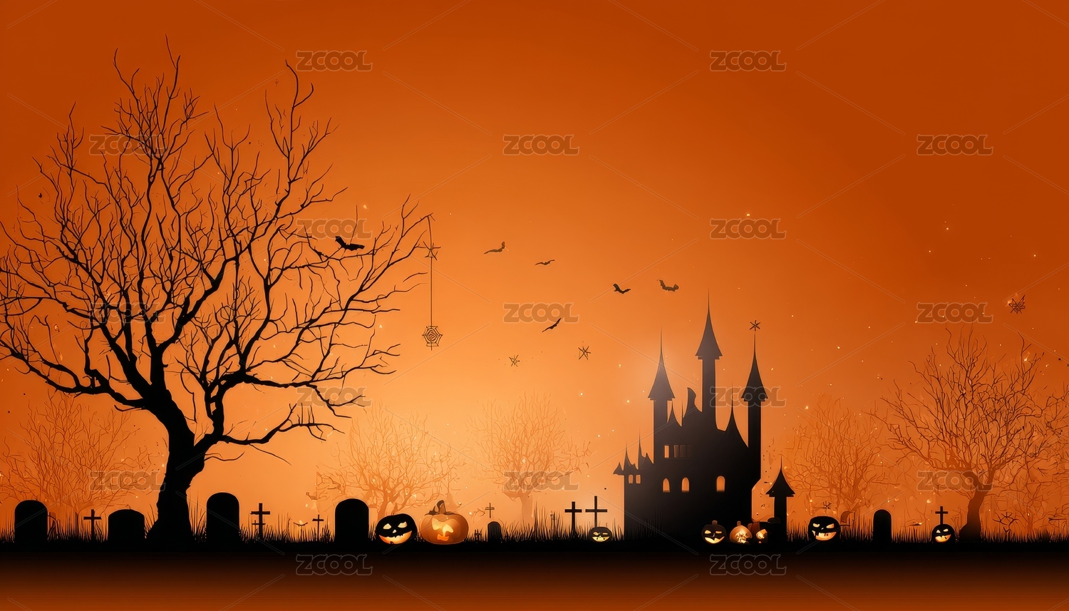 卡通黑色城堡剪影万圣节派对活动月亮插画