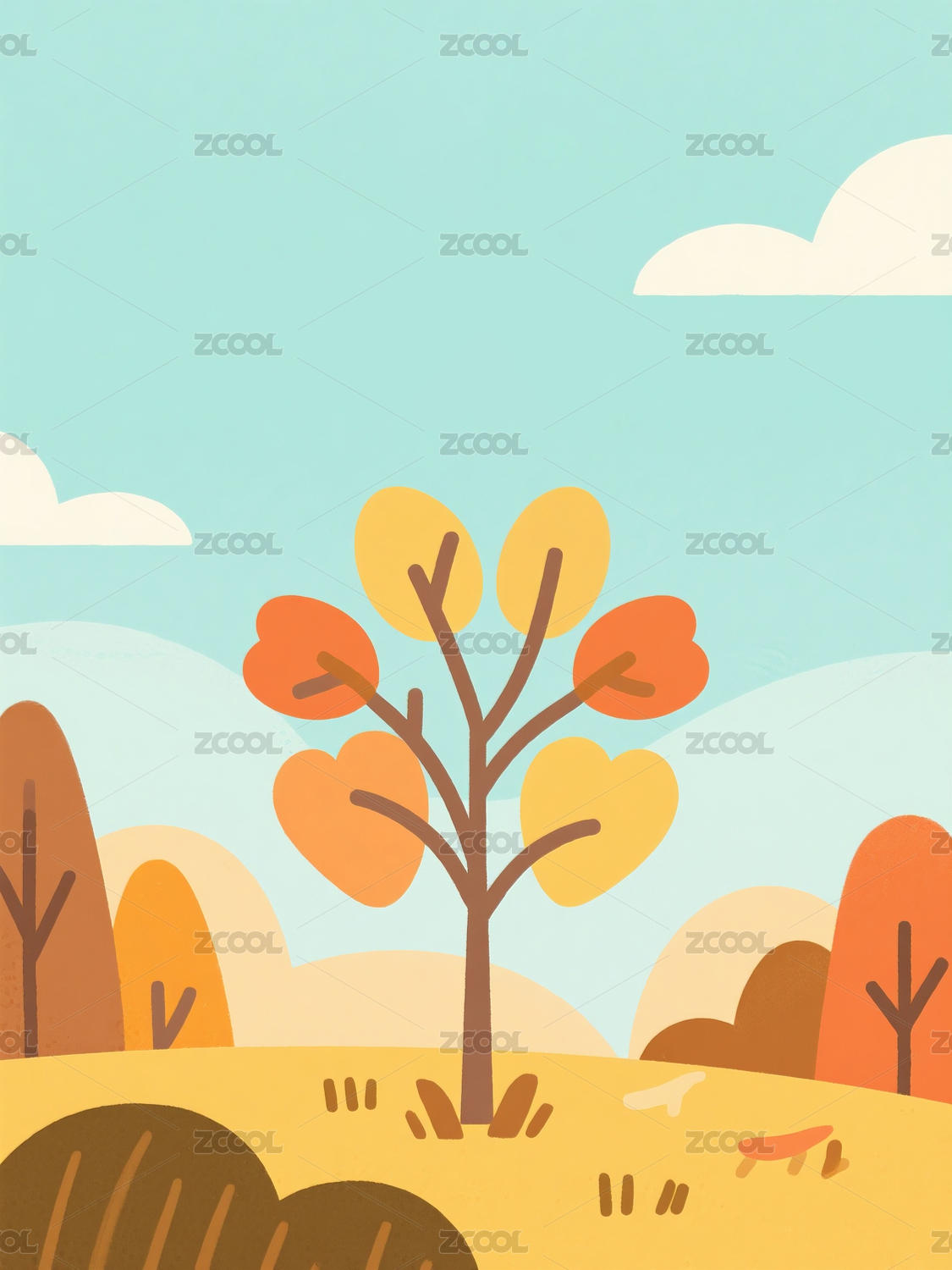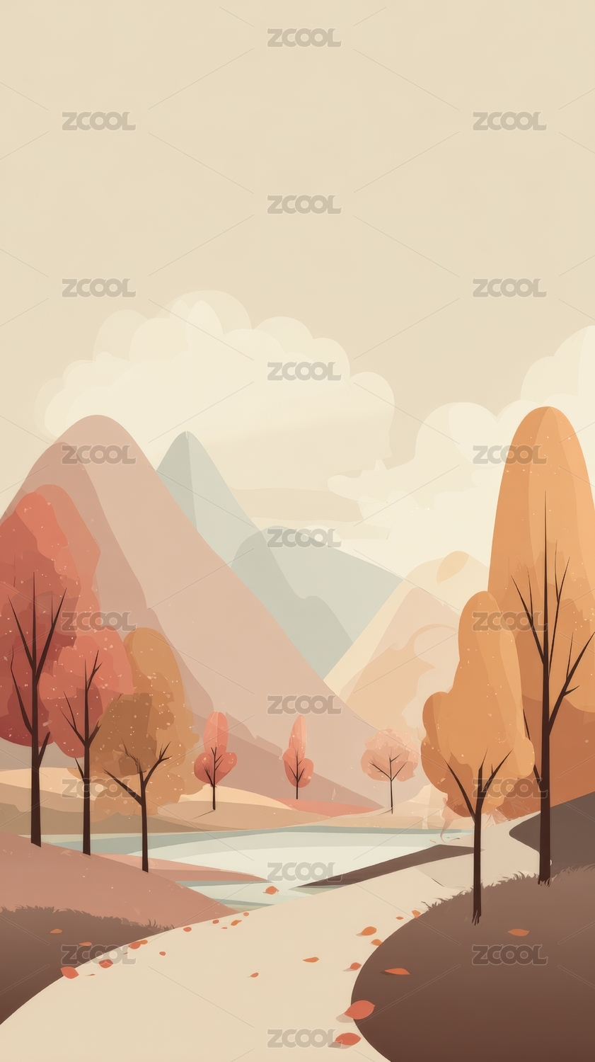 秋天,暖黄,棕色系,山景,风景,树,扁平风,插画,橙色,简洁