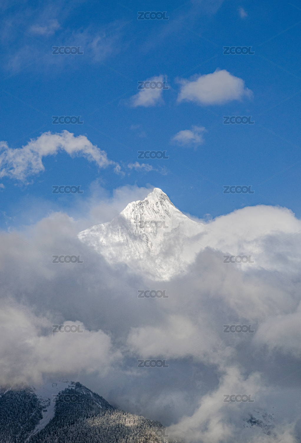 晴空多云笼罩的梅里雪山卡瓦格博峰顶及山坡