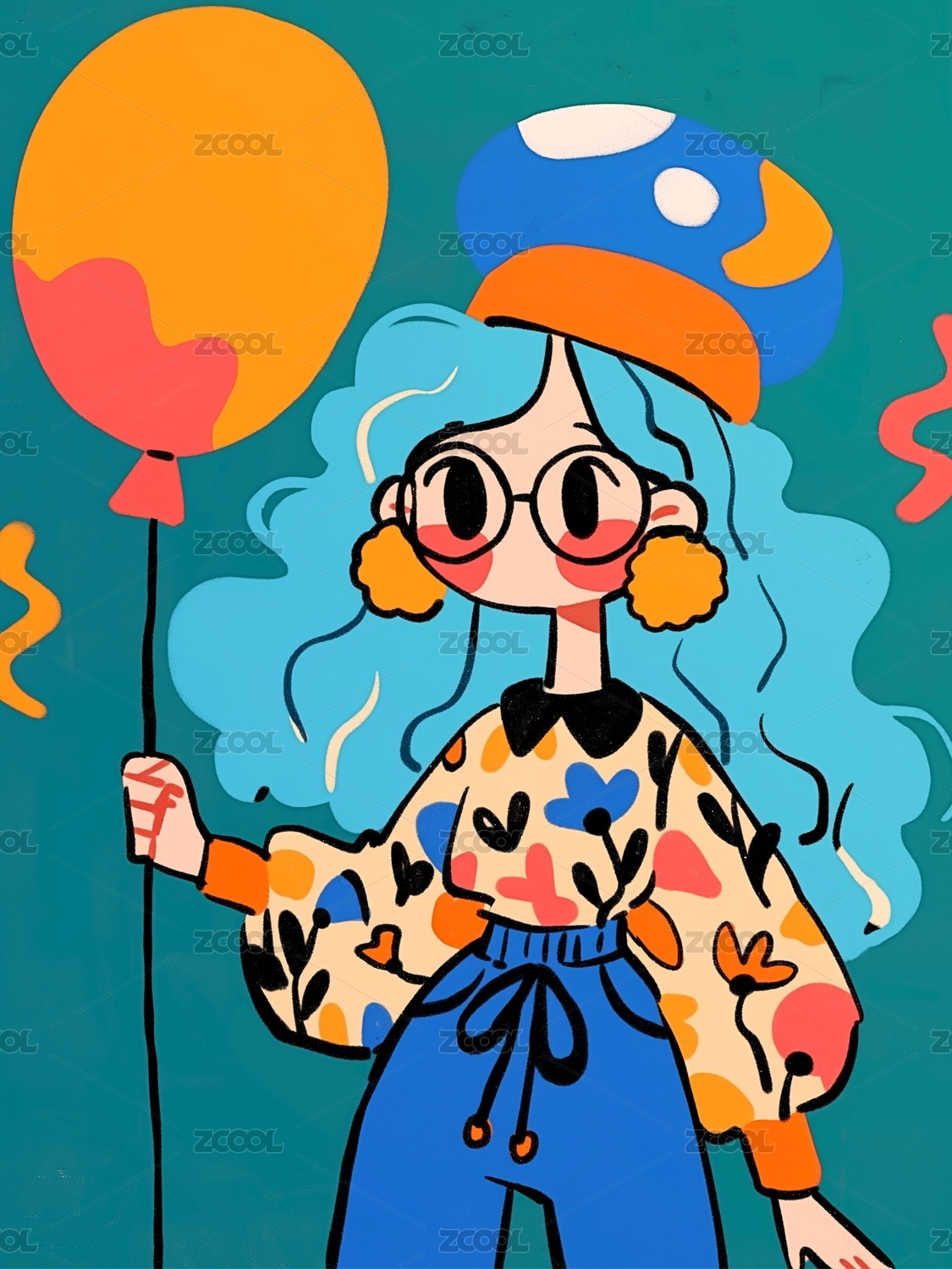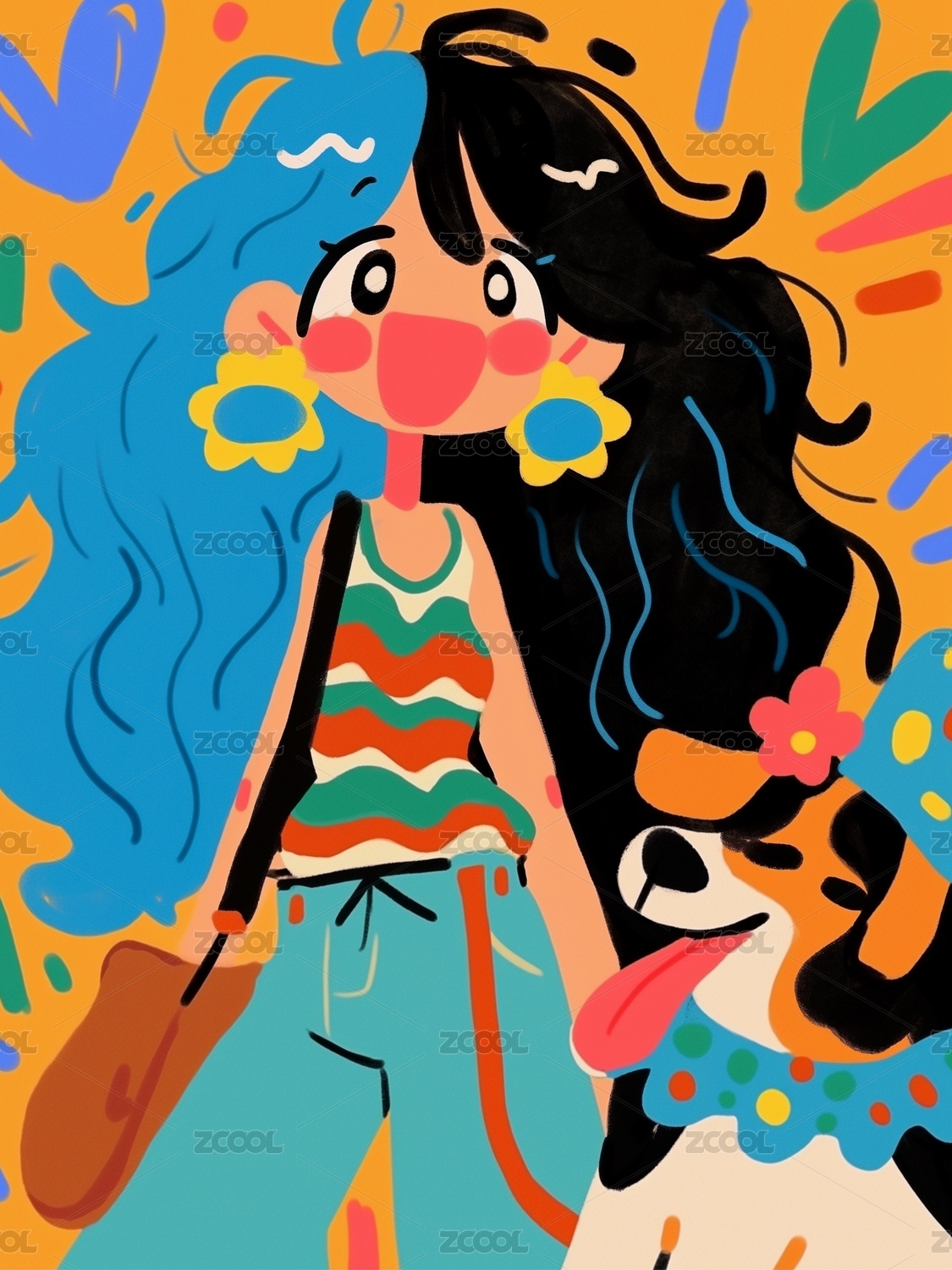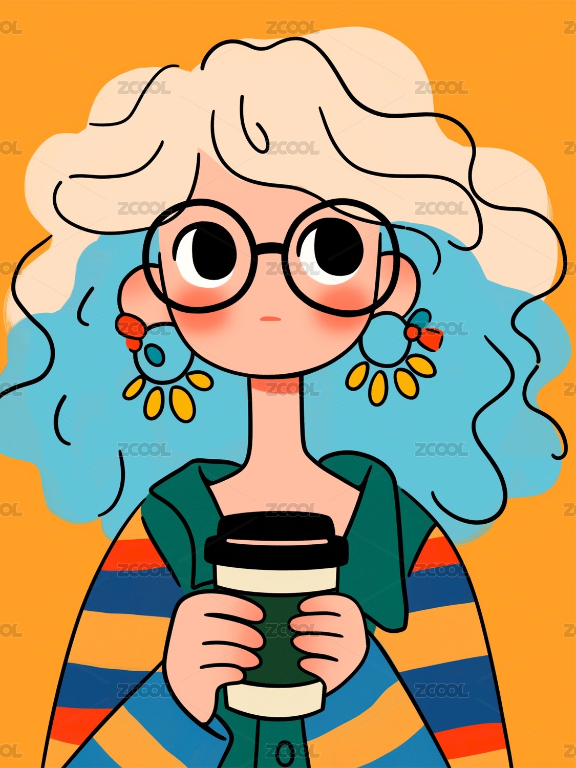 可爱,咖啡,涂鸦风,女孩,插画,长发