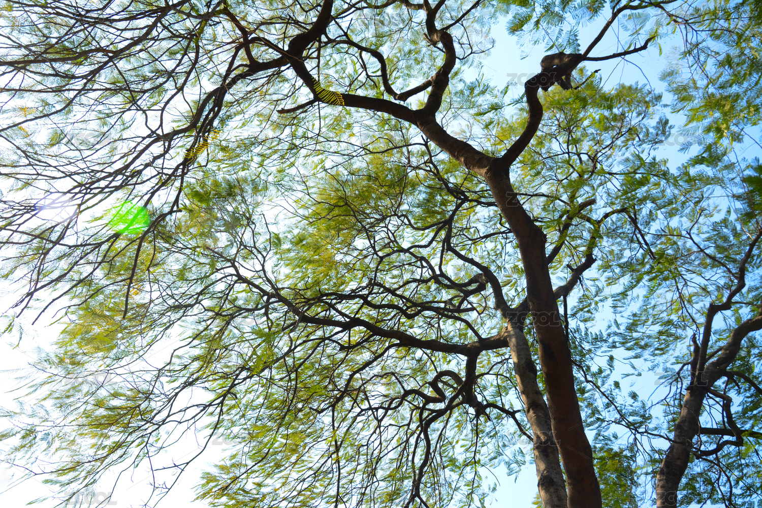 秋季户外蓝色天空下向上伸展的繁茂树枝