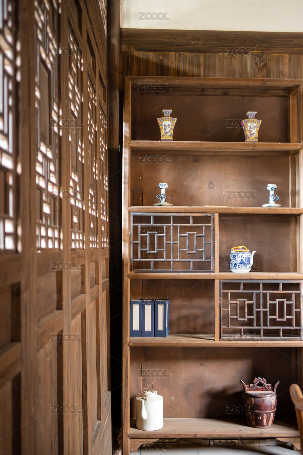 福建龙岩长汀县卧龙书院中式木制书架与摆件