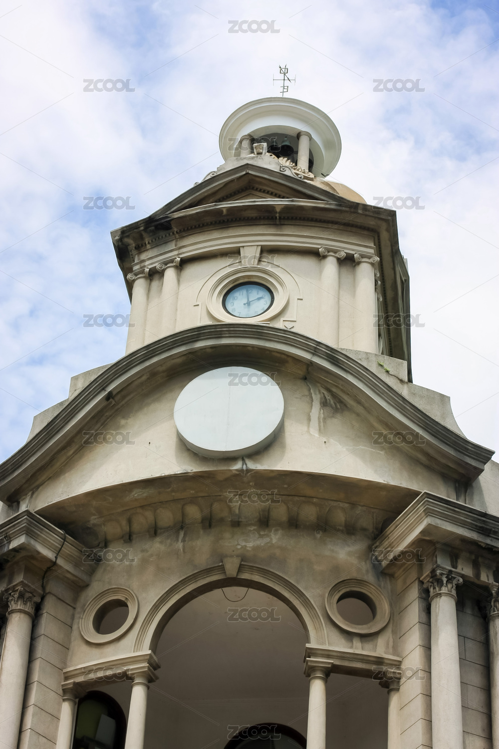 仰拍蓝天下德国法兰克福市中心教堂钟楼