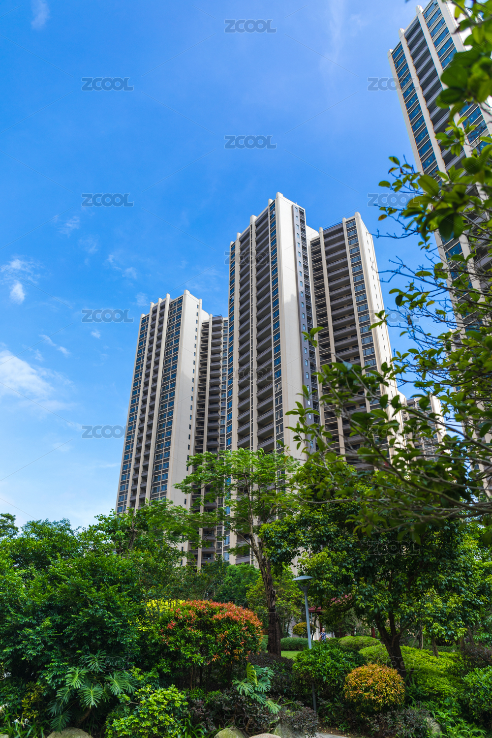 花园中的高层住宅低角度视角
