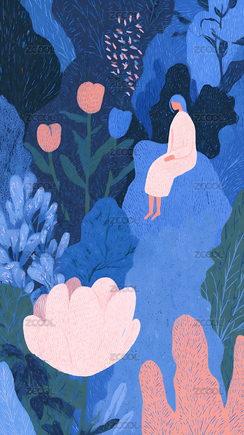 女孩在花丛中插画