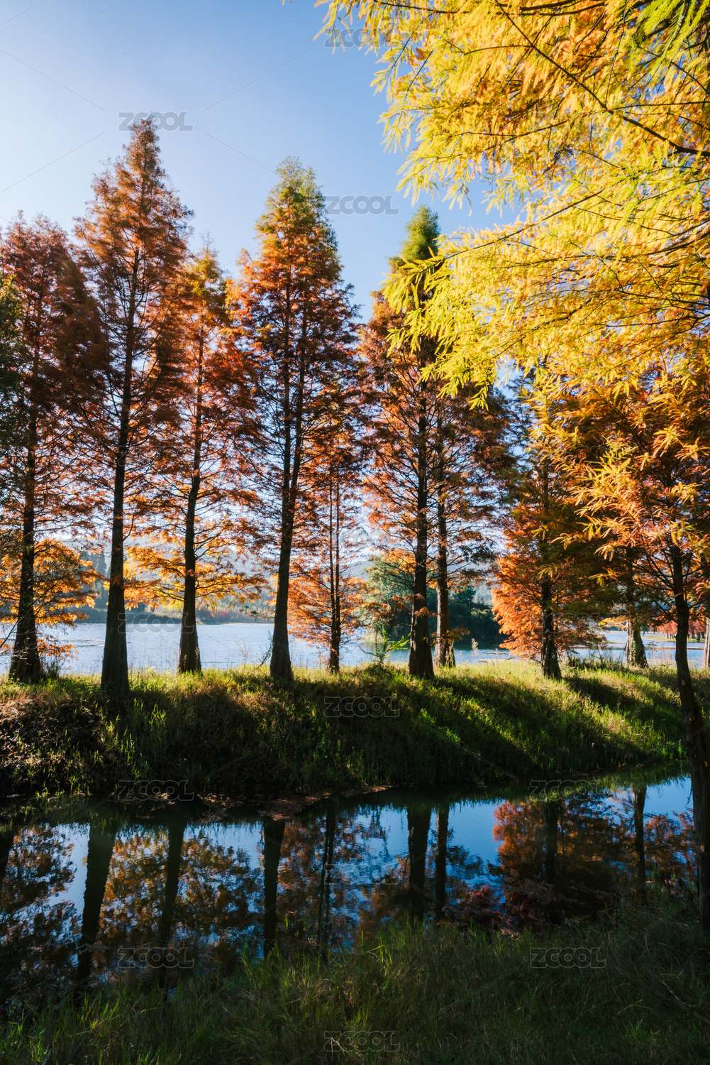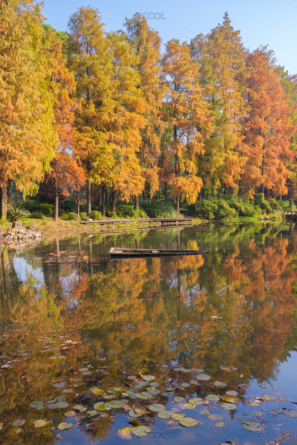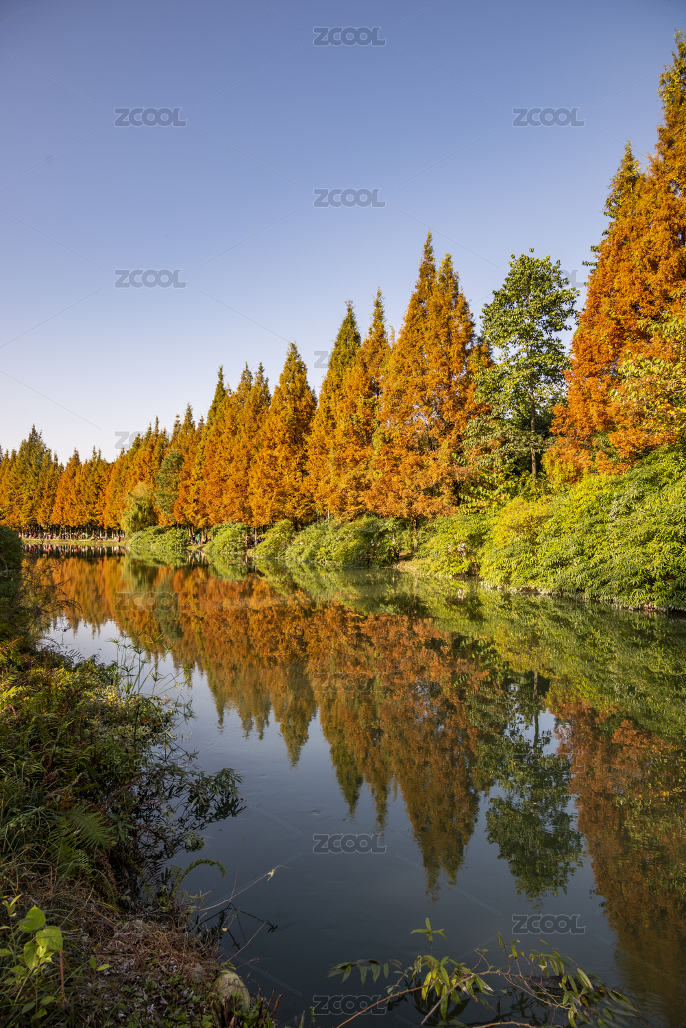 中国上海共青森林公园秋色景观溪流湖泊森林倒影