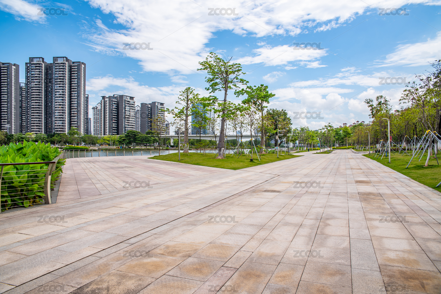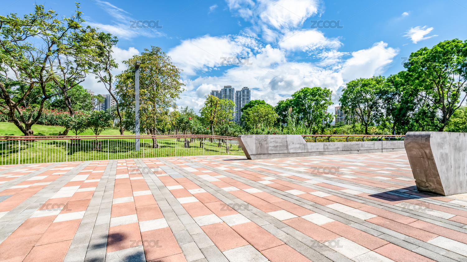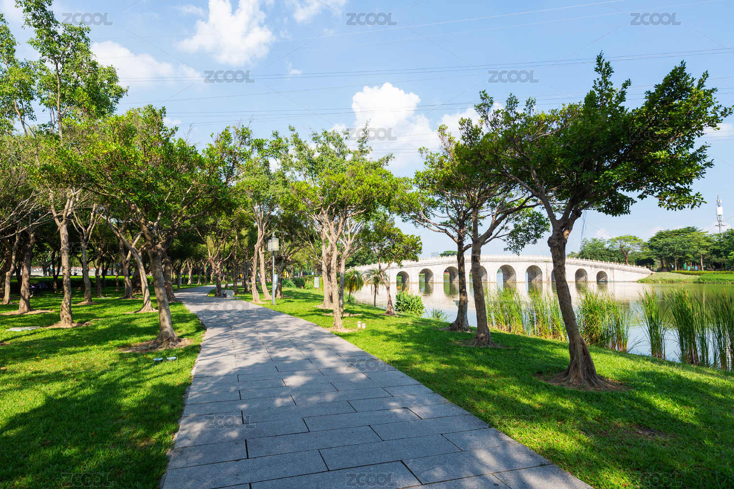 夏季蓝天白云下的深圳香蜜湖公园人行步道