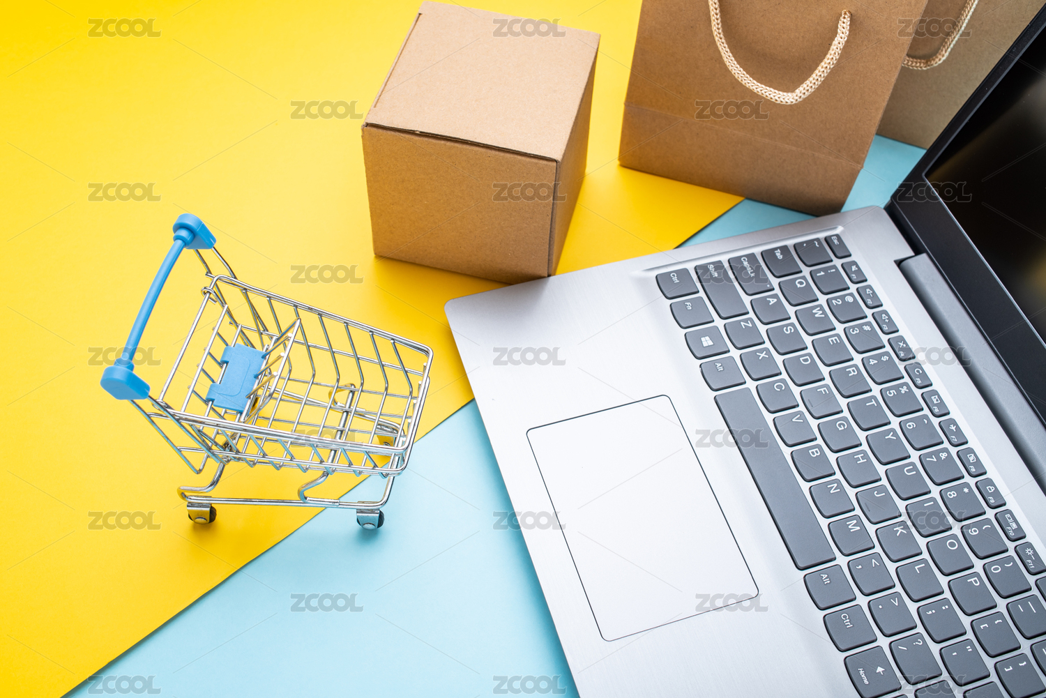 办公桌上的笔记本电脑和网购纸箱购物车背景素材