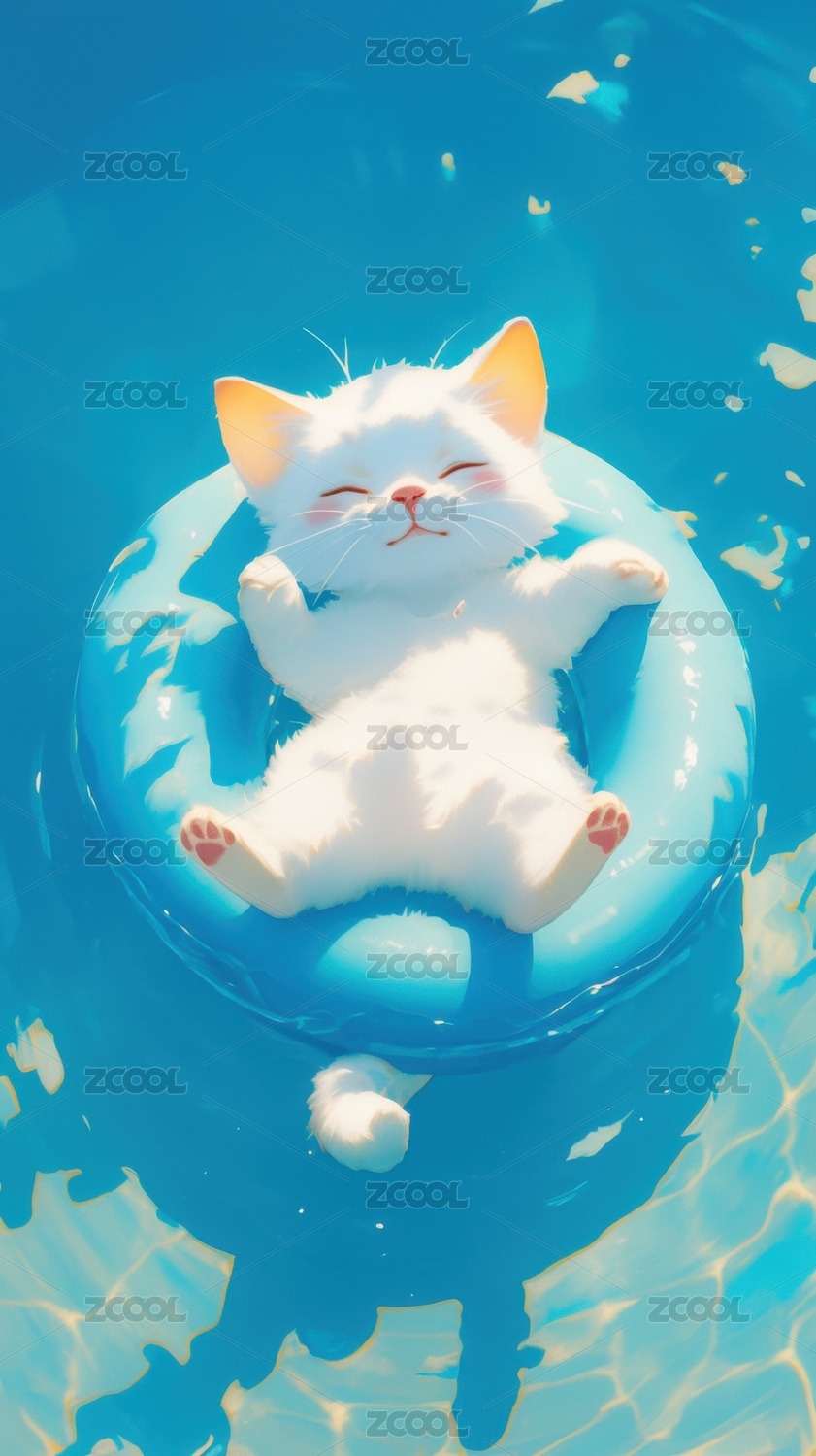 白色猫咪悠然躺在蓝色泳圈中