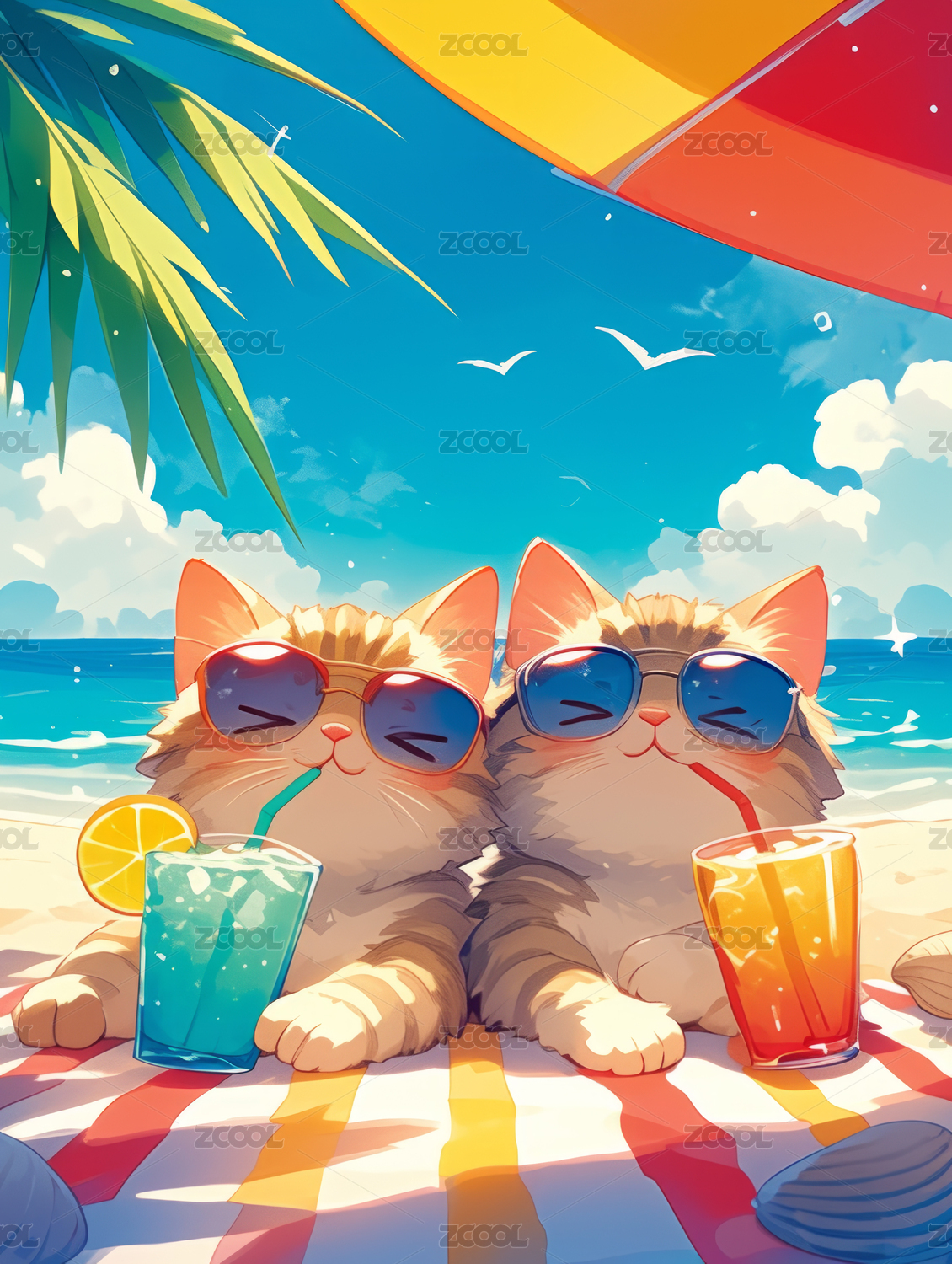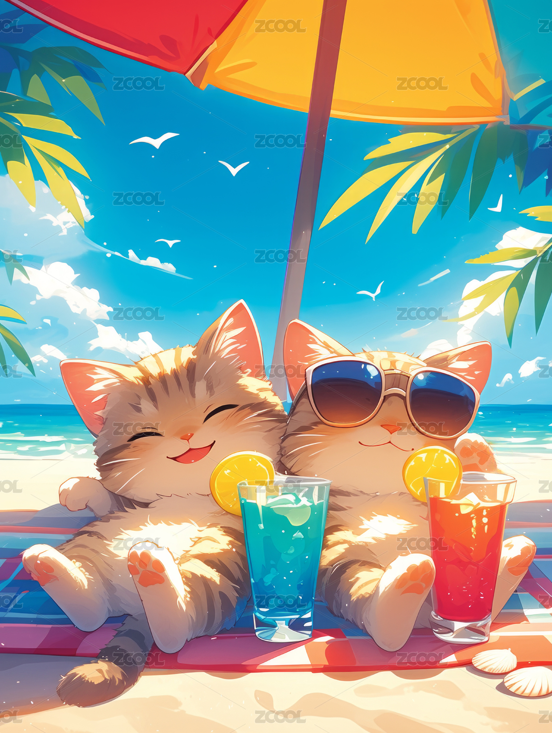夏日沙滩上休闲的卡通小猫