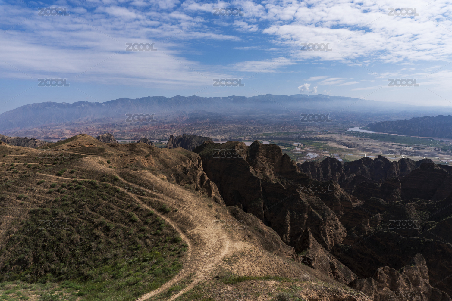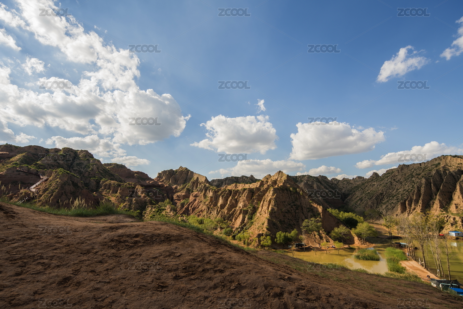 蓝天白云下的甘肃兰州树屏丹霞地貌