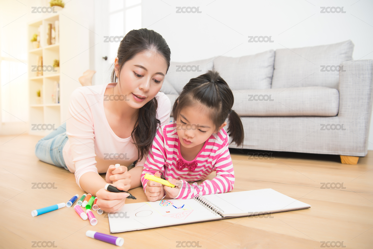 母亲和女儿是在木地板有乐趣躺着客厅在家中画画。家庭活动的概念。