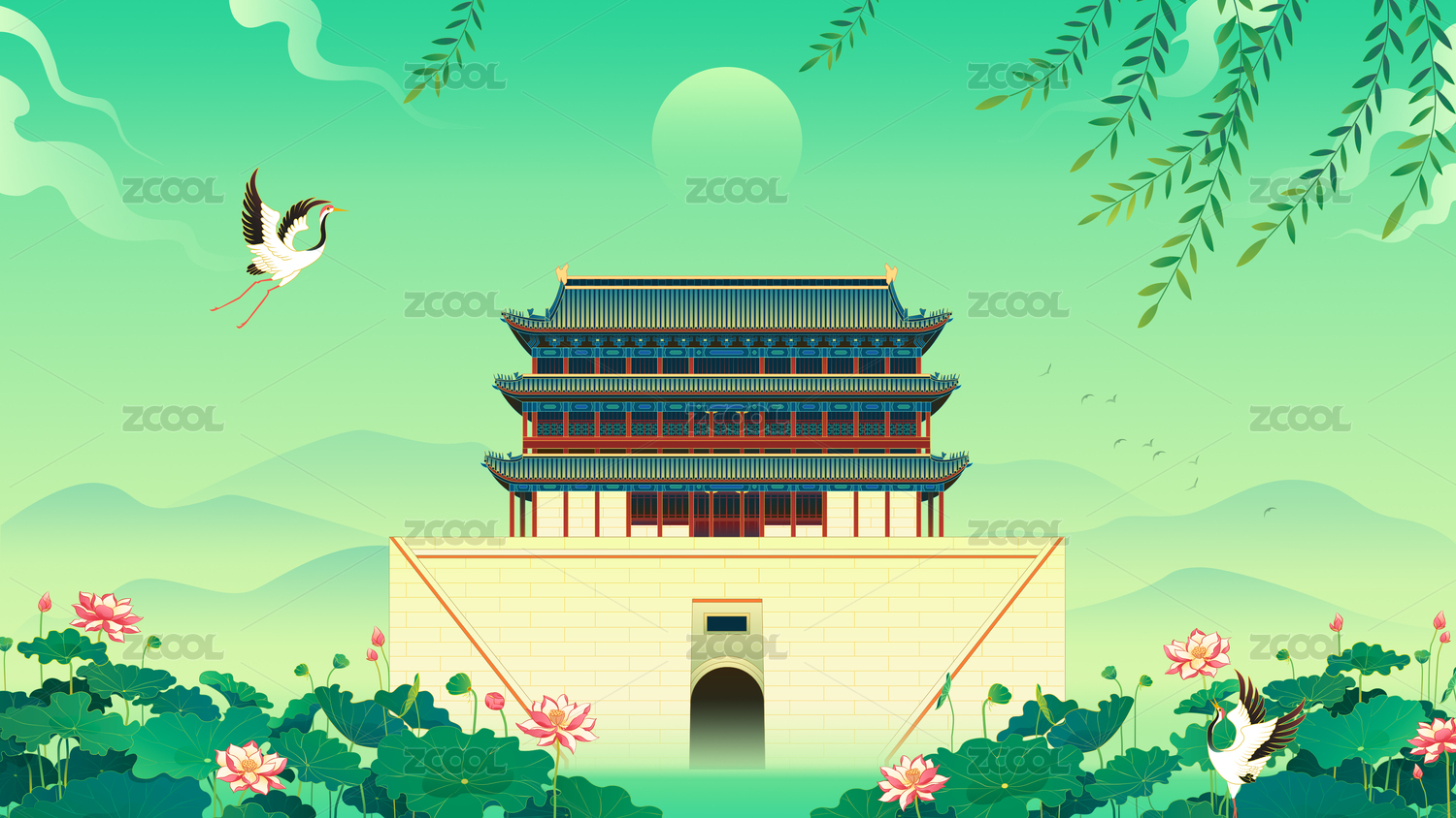西安大唐芙蓉院夏季荷花柳叶国潮风插画