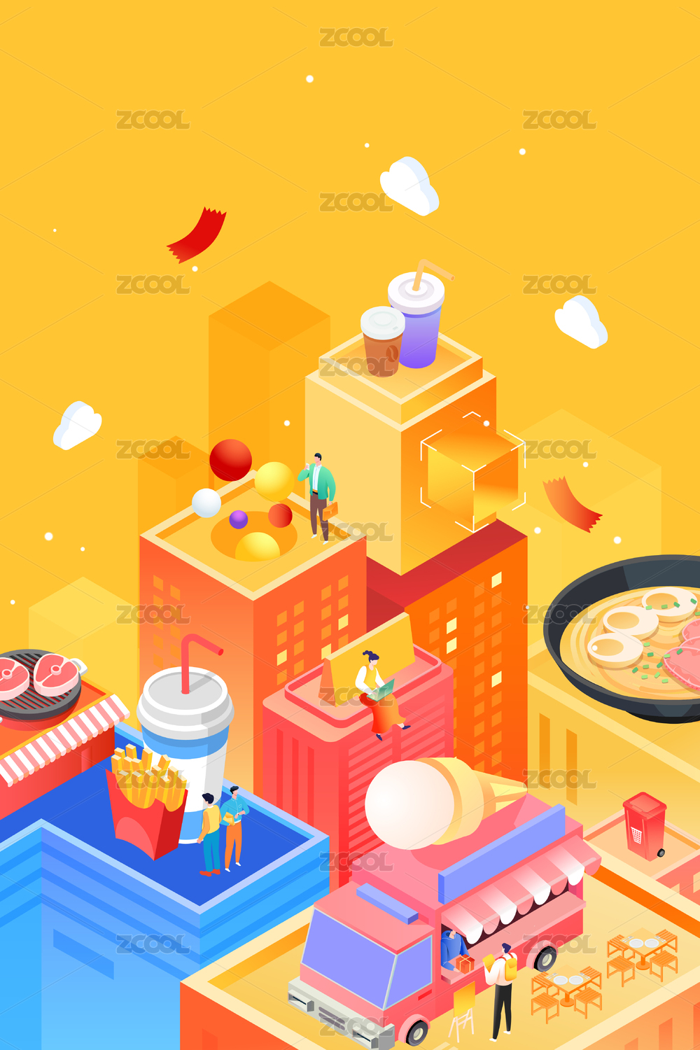 2.5D等距美食城市服务矢量插画