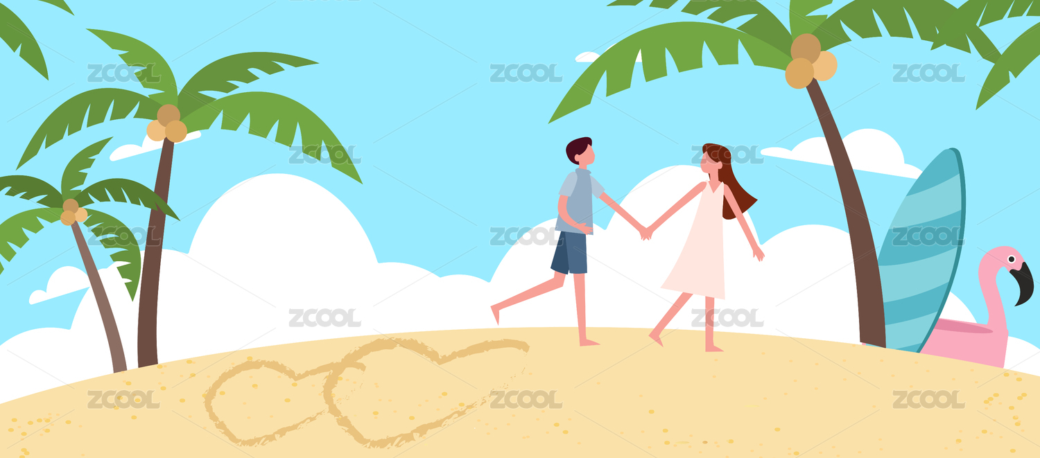 夏天情侣牵手海滩散步插画