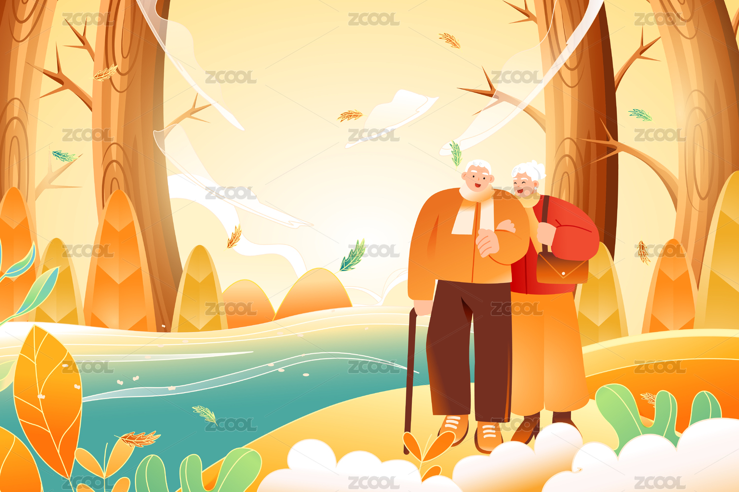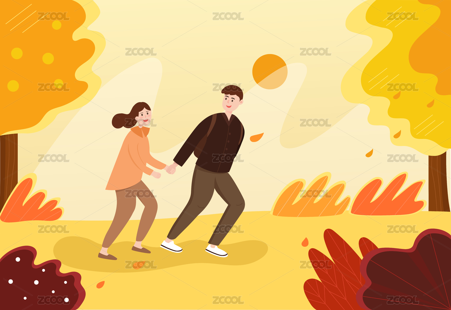 秋天情侣人物户外活动插画秋季旅行郊游海报