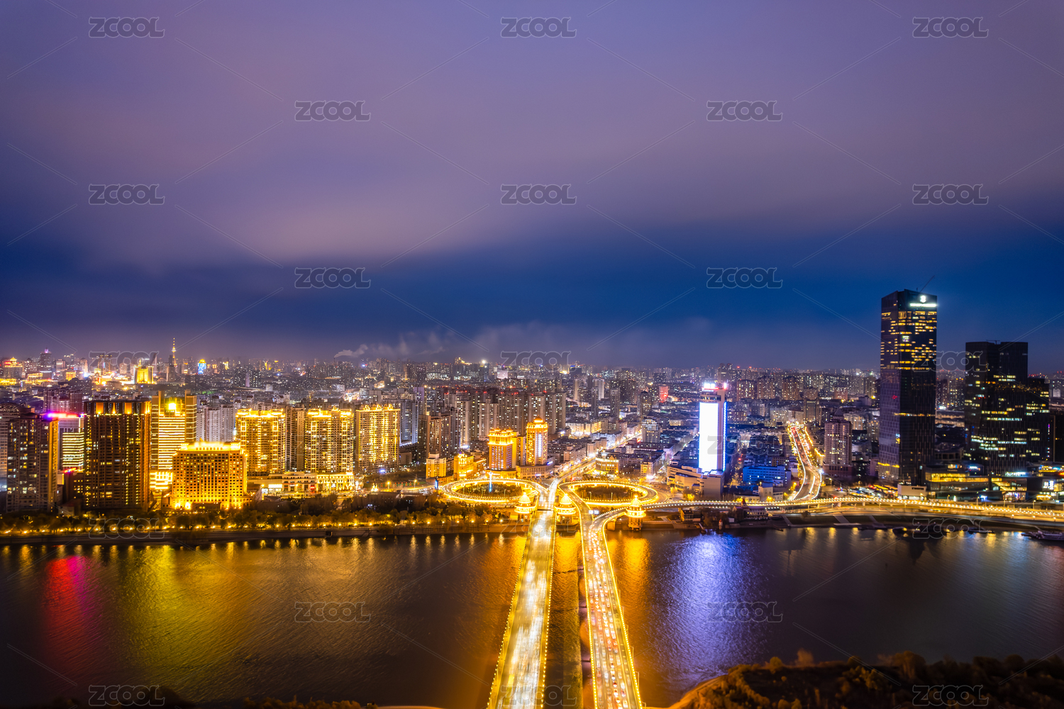 中国黑龙江哈尔滨松花江公路大桥夜景航拍