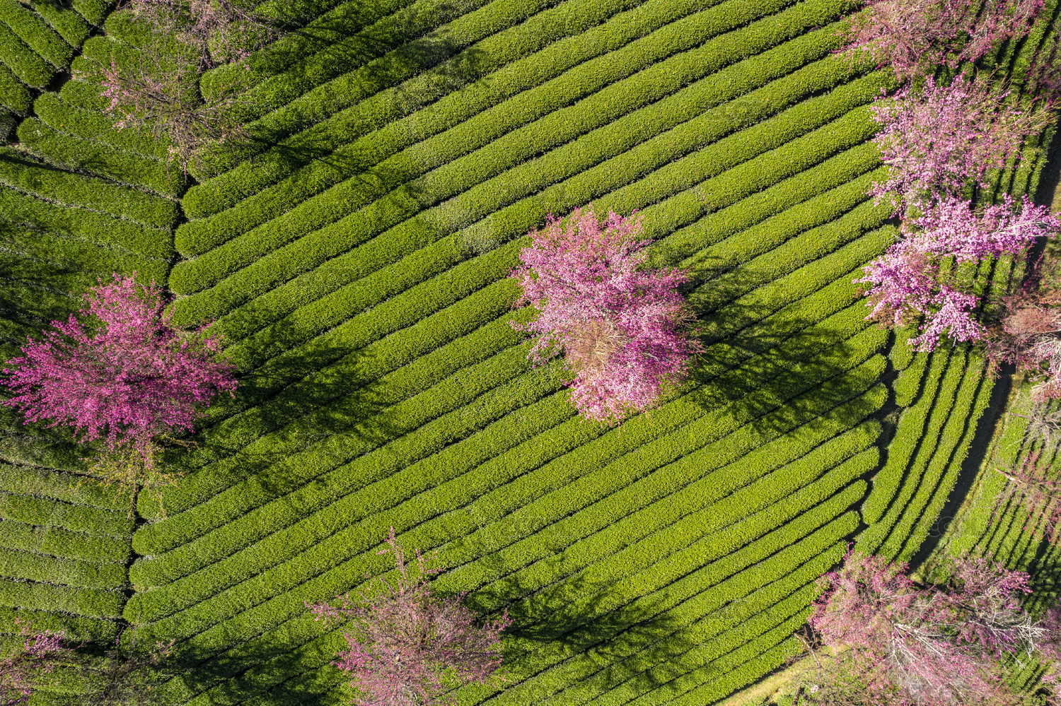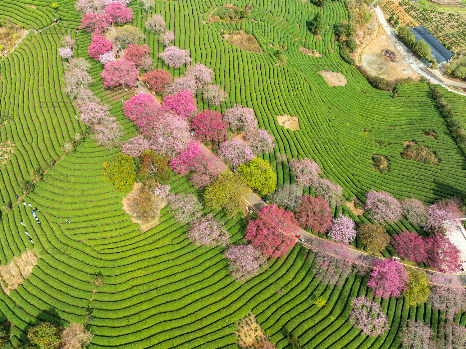 中国云南大理无量山樱花谷春天茶园航拍风景