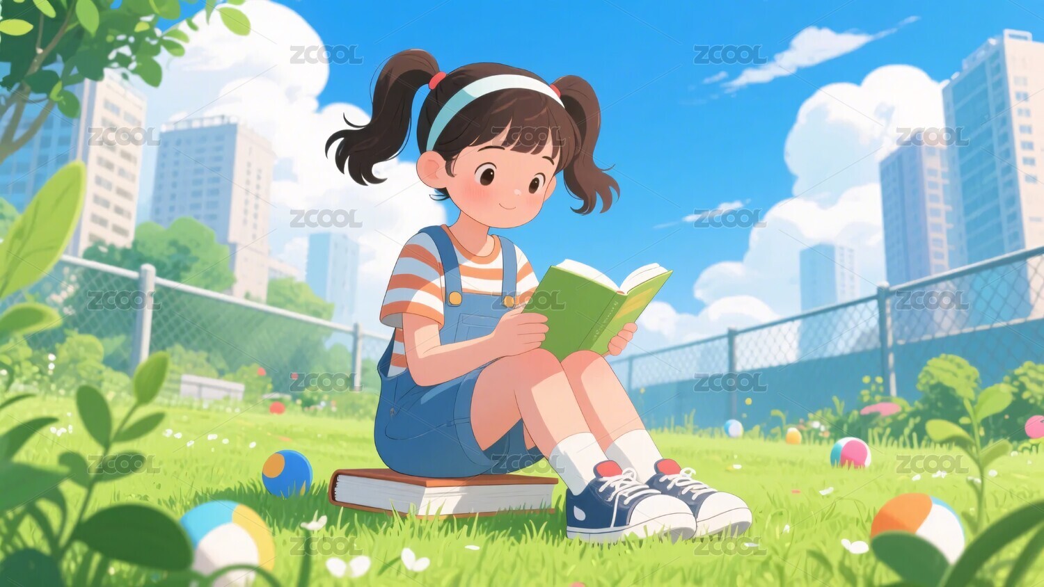 坐在书籍上认真看书的双马尾小女孩
