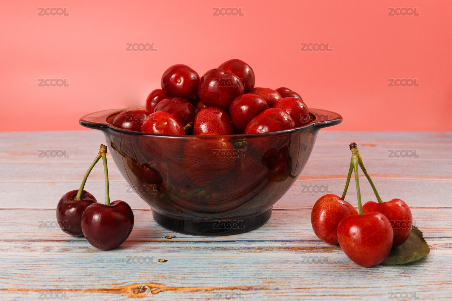 浅色木桌上放着一碗新鲜诱人的大樱桃