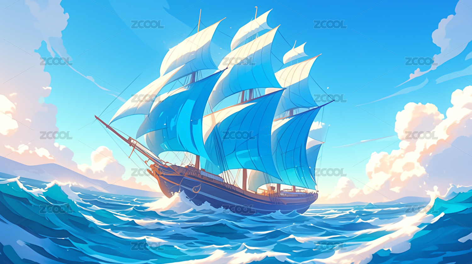 复古帆船与蔚蓝海景的唯美插画