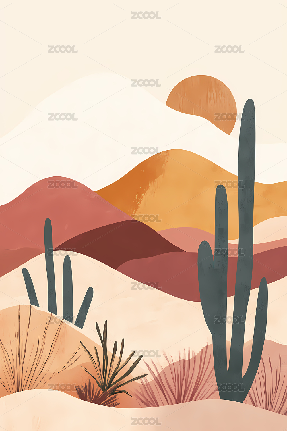 AIGC202404,卡通,插画,沙漠,骆驼,仙人掌,植物,炎热,旅行,风光