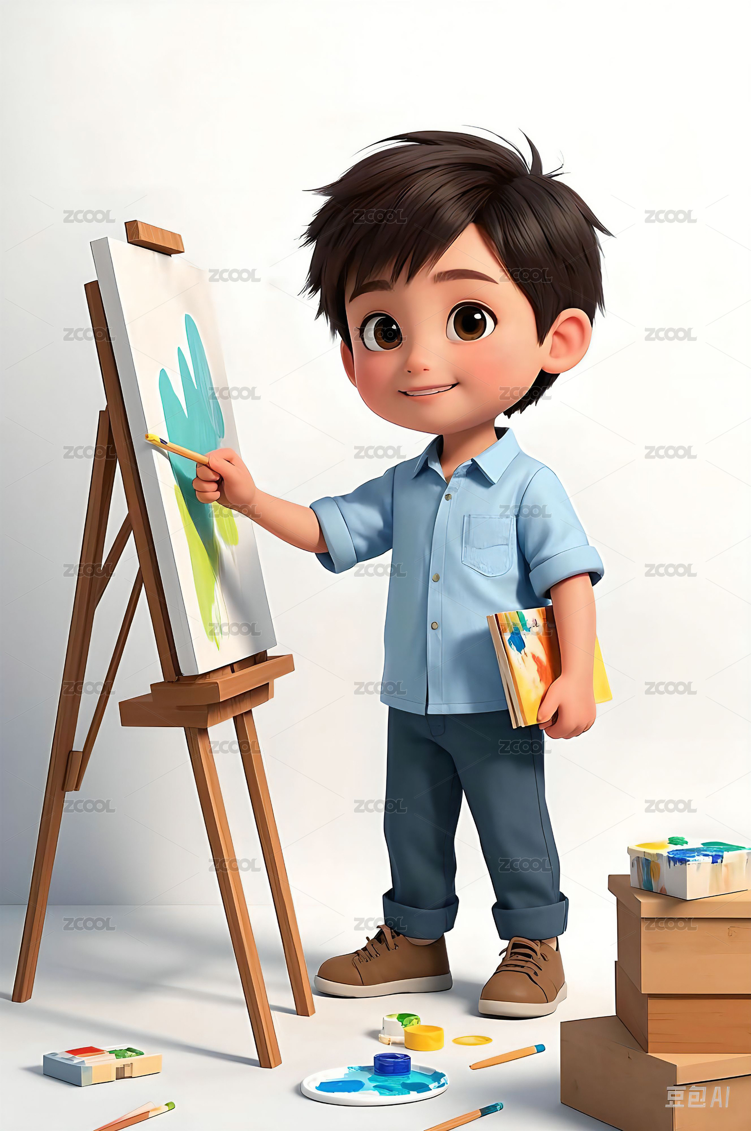 3d风格一个小男孩正在画画场景插画