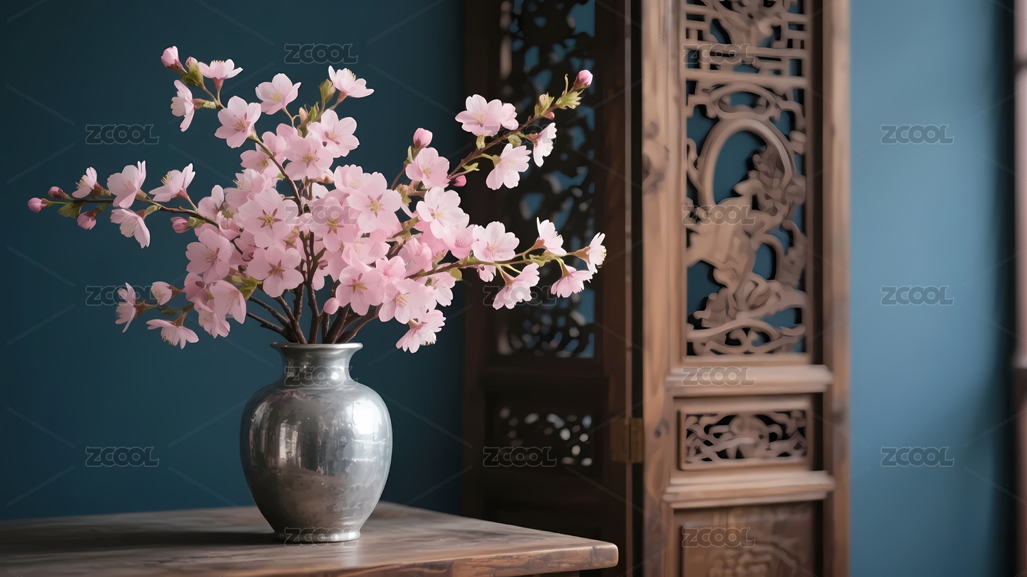 樱花与雕花屏风的优雅组合