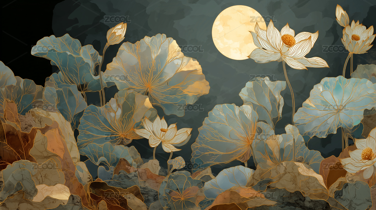 月夜莲花池塘宁静唯美意境
