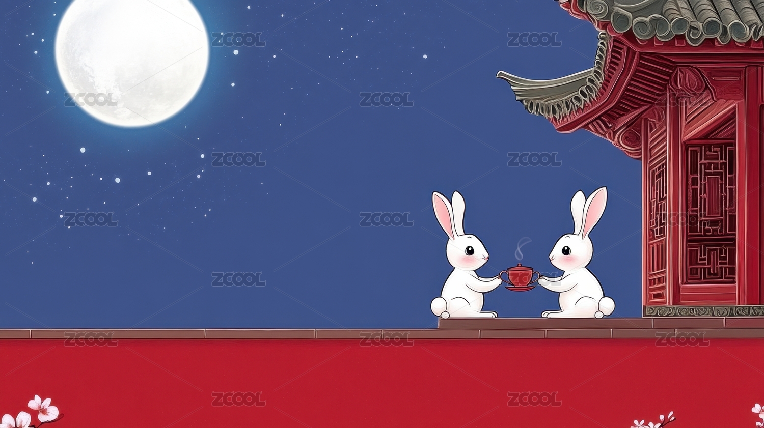 中秋节红色氛围屋顶上的兔子和圆月插画背景