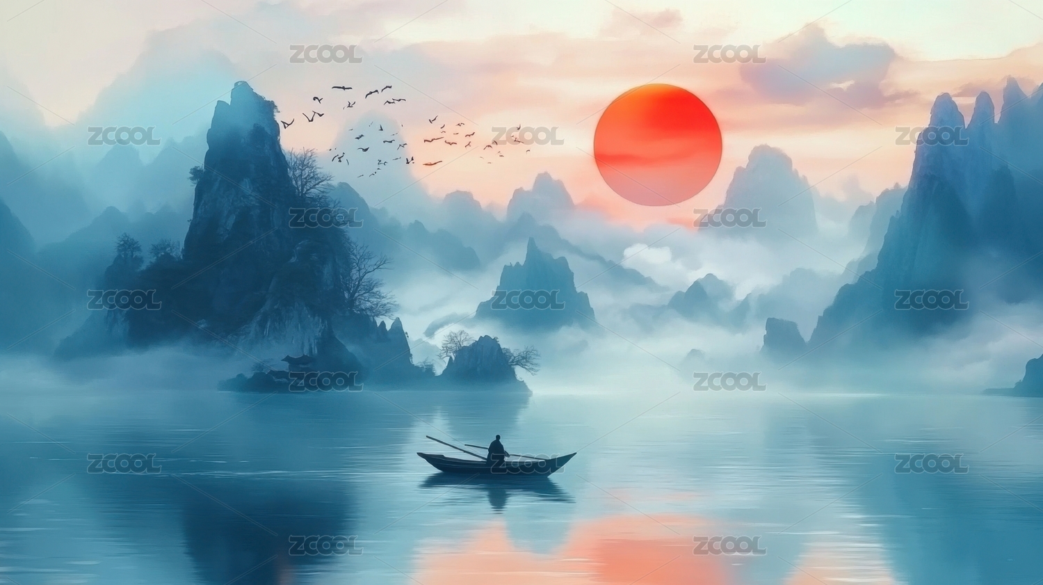 雾笼山水,舟行静谧湖面