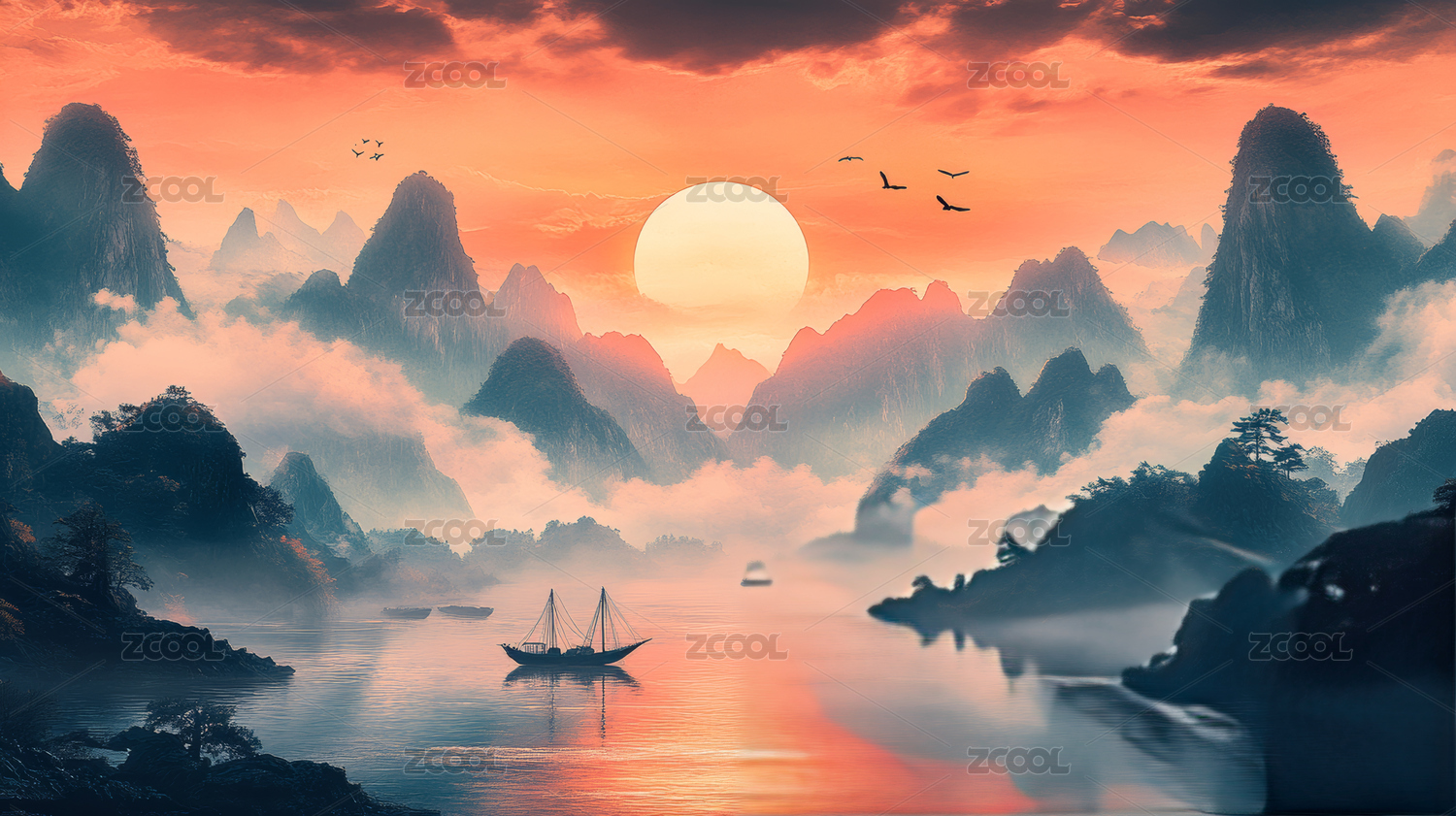 山水日出日落色彩旅