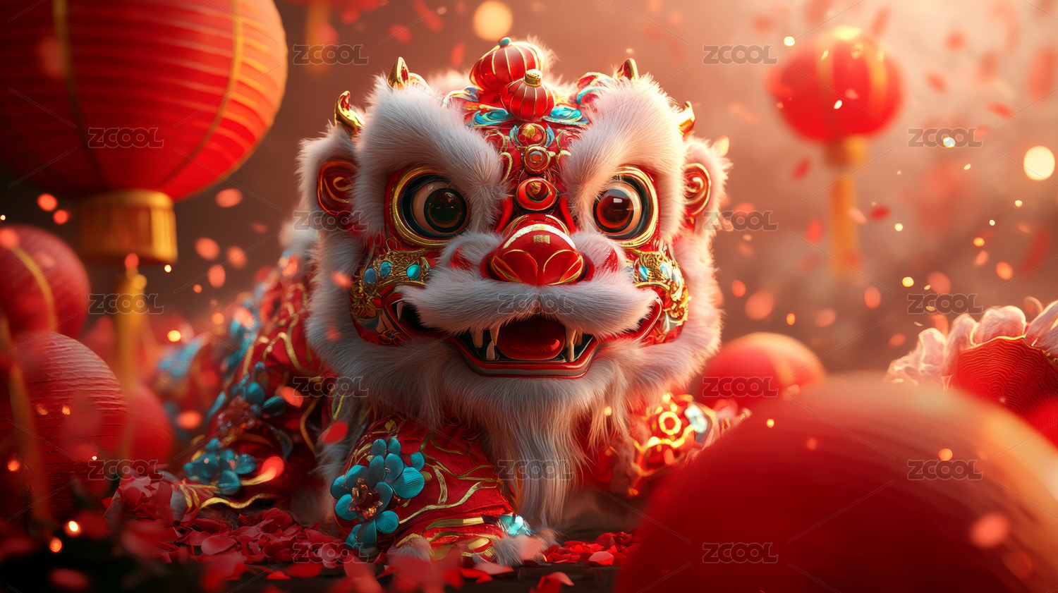 春节元宵过年庙会灯会上的舞狮与灯笼烟花