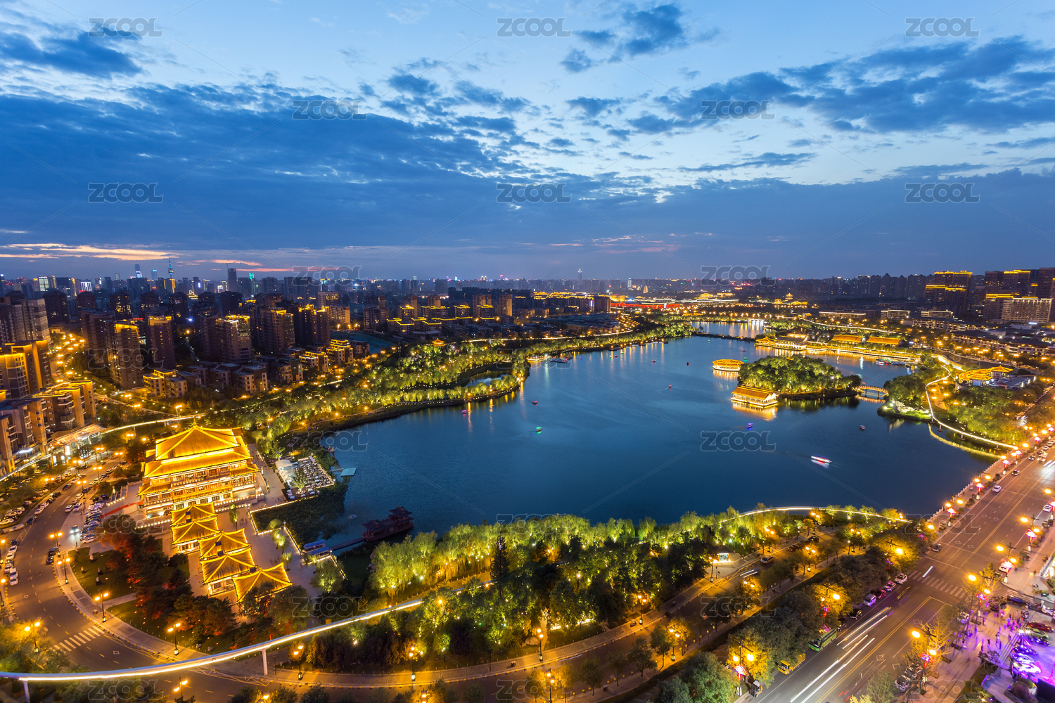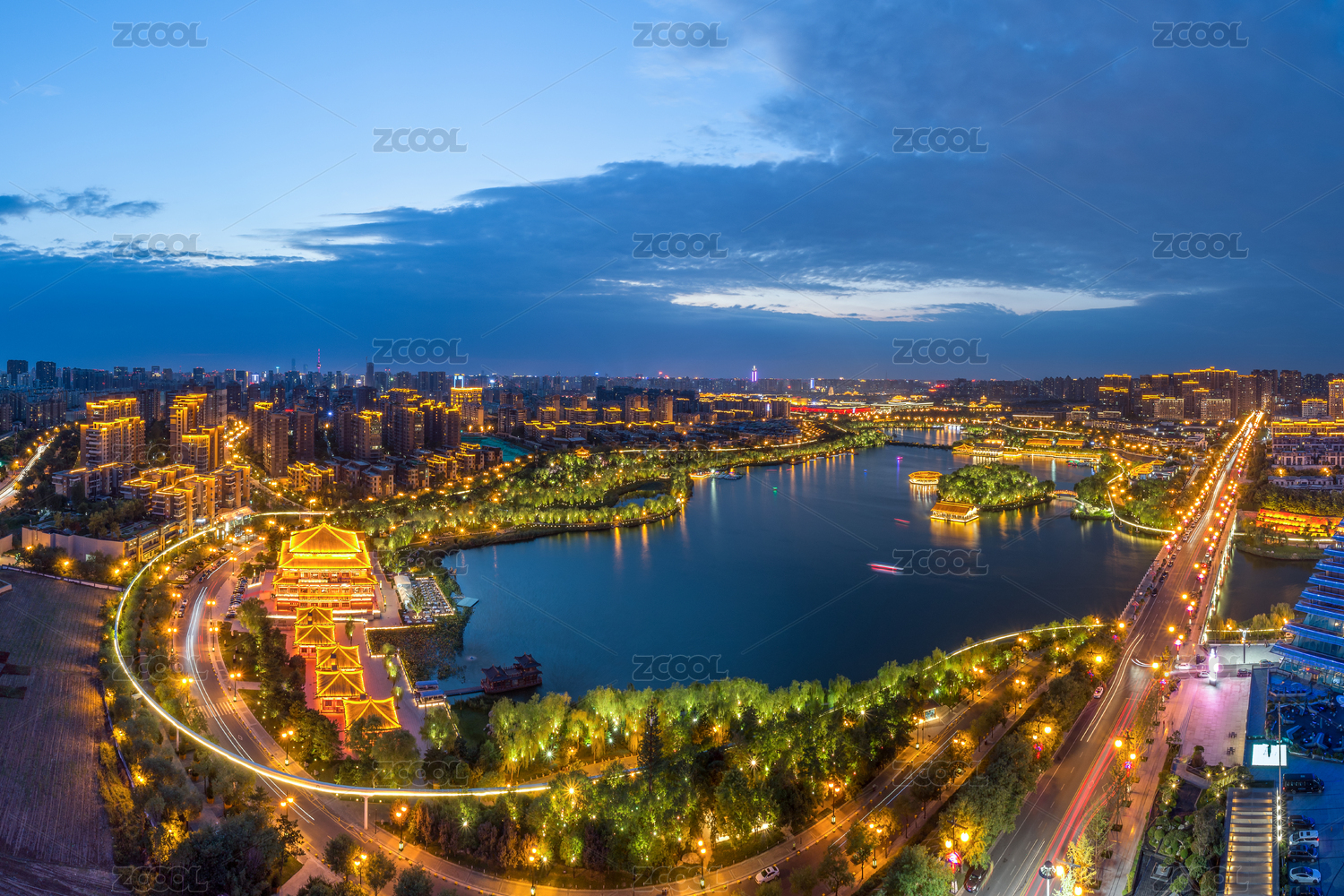 夏季夜晚的人文西安新标志曲江池遗址公园