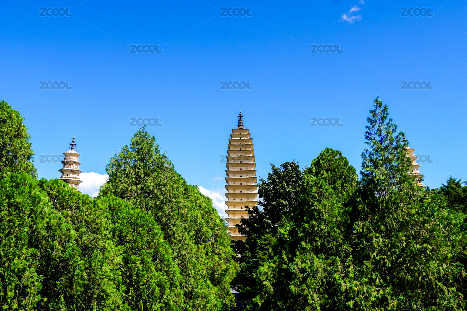 蓝天下云南省崇圣寺大理三塔风光