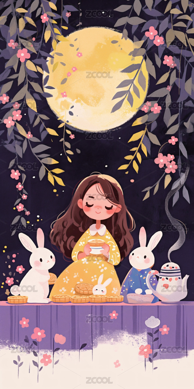 插画,中秋节,夜晚,女孩,兔子,吃月饼,月饼,茶壶,壁纸,开屏