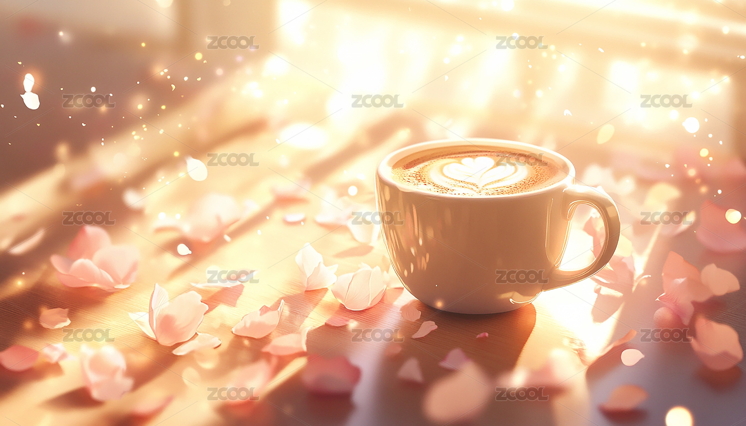 一杯咖啡和蜜桃玫瑰花瓣