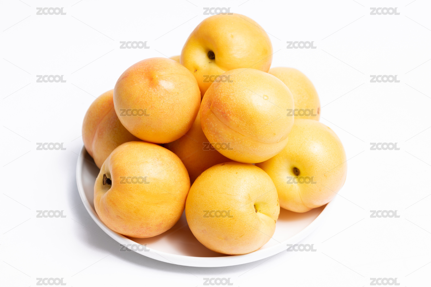 白底上放着一堆锦绣黄桃和黄桃果肉